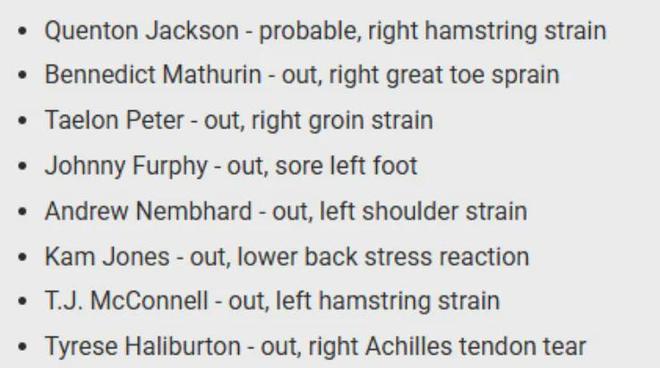 开季表现强势的霍姆格伦出现了背部酸痛,鹈鹕的穆雷至今没打过,步行者更是可以列出长长的伤病名单,比如马瑟林、托平、内姆布哈德、麦康奈尔和哈利伯顿。